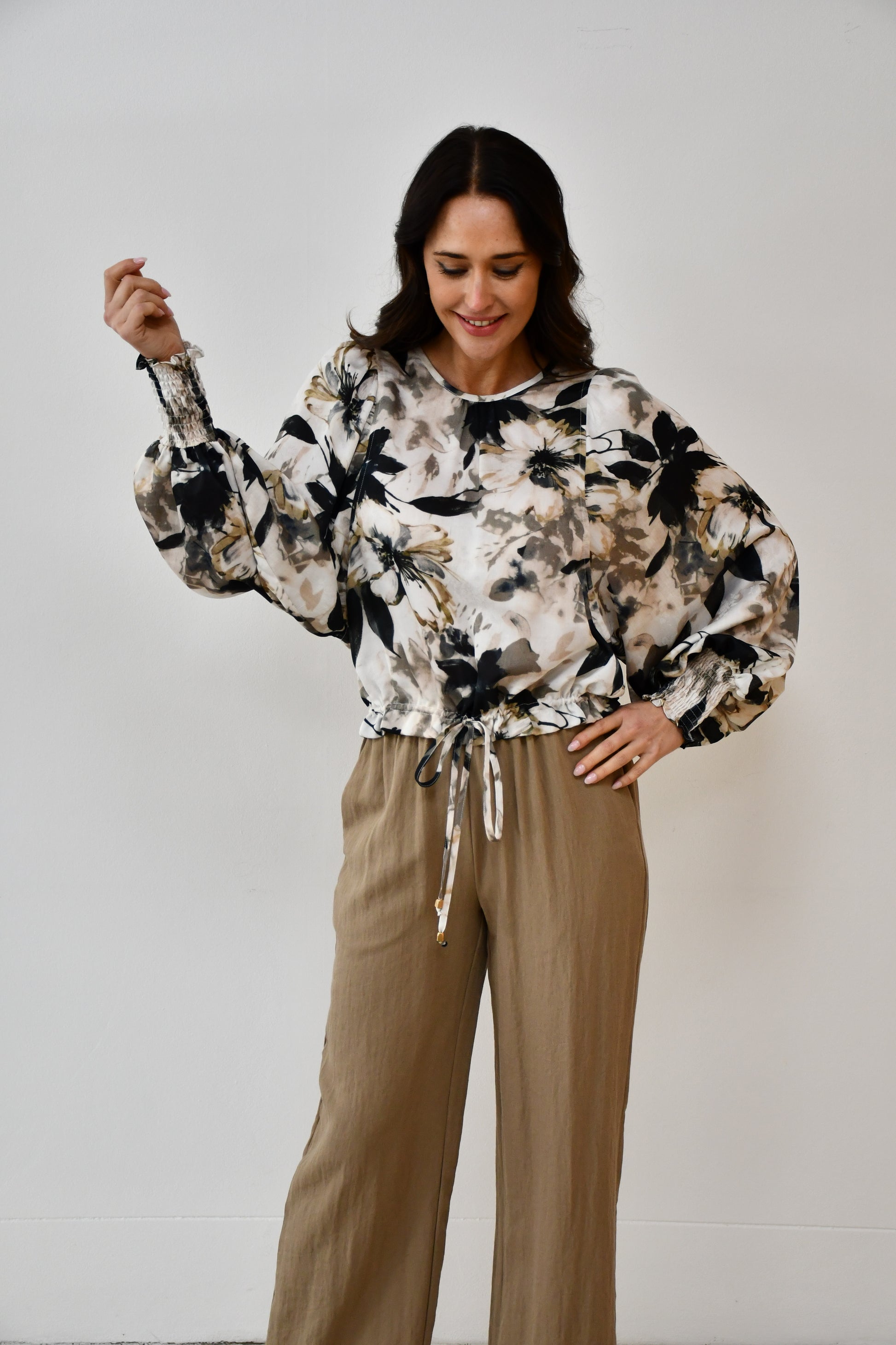 Elegant and versatile, this blouse features a soft watercolour floral print in neutral tones of beige, black, and taupe. Designed with a relaxed fit, it has a round neckline, voluminous long sleeves with smocked cuffs, and a drawstring hemline that allows you to adjust the silhouette for a flattering fit. Perfect for pairing with tailored pants or jeans, this top transitions seamlessly from day to evening wear.