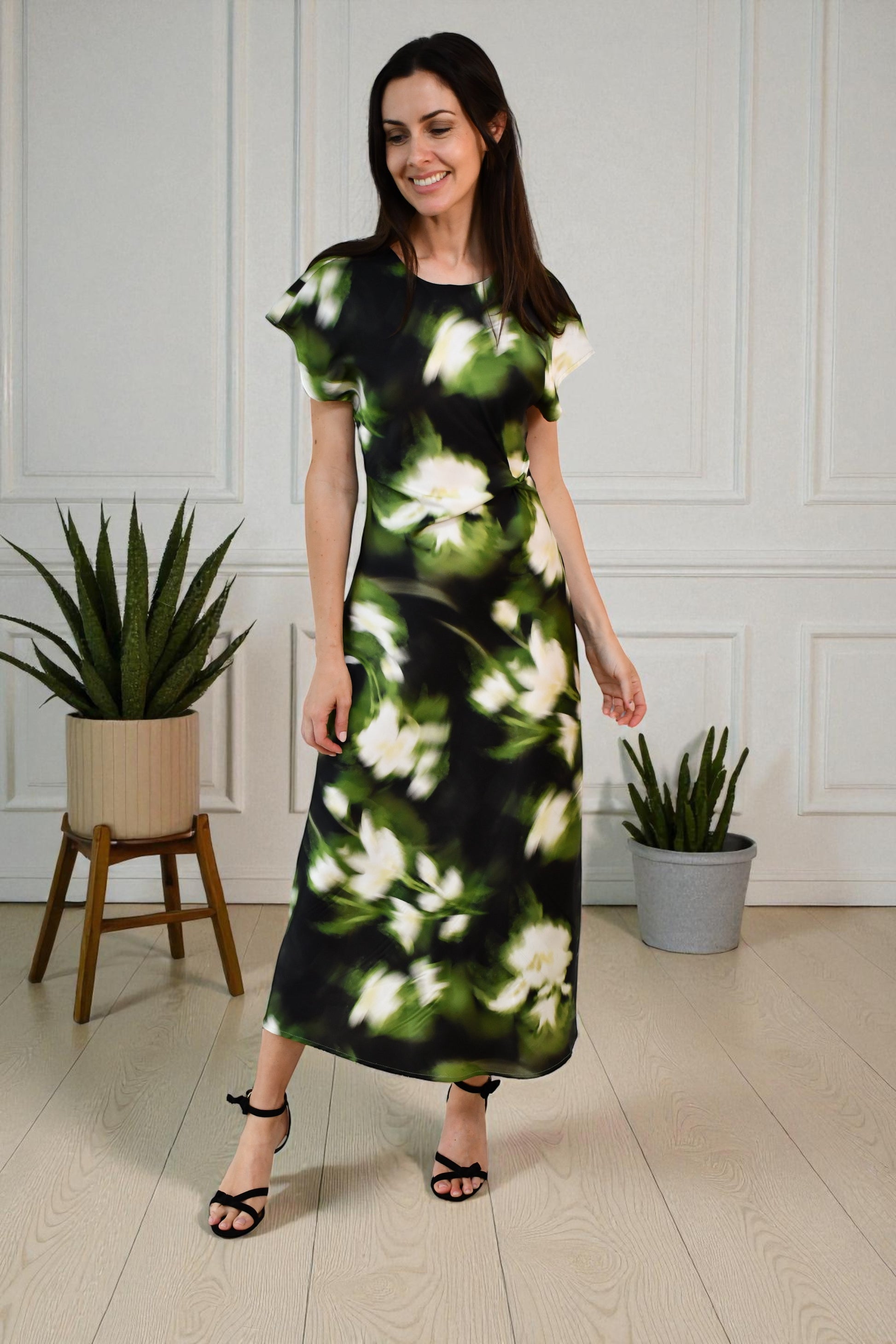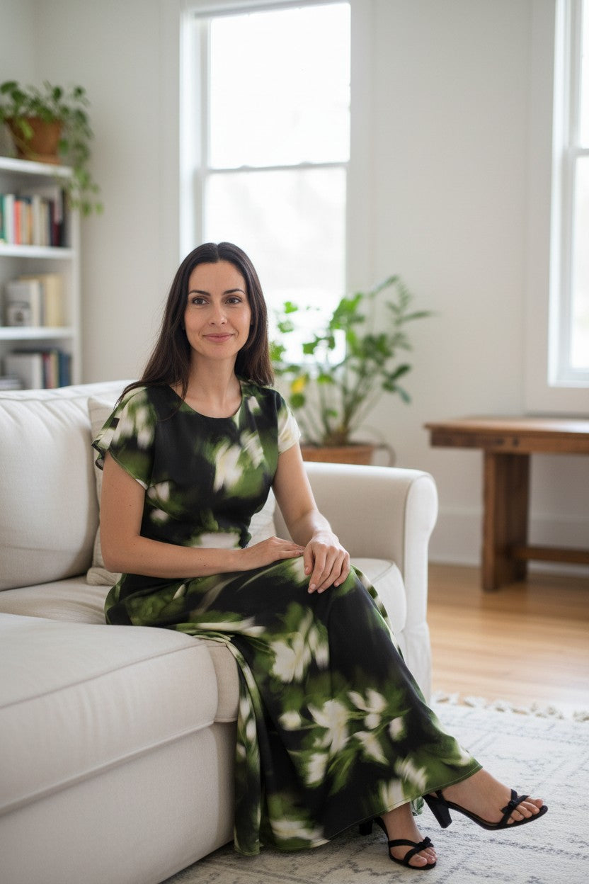 Make an unforgettable impression in this stunning satin maxi dress, featuring a soft botanical blur print in deep green, black, and white tones. The dreamy, painterly design creates a fluid, almost ethereal visual effect — perfect for both day events and evening elegance.