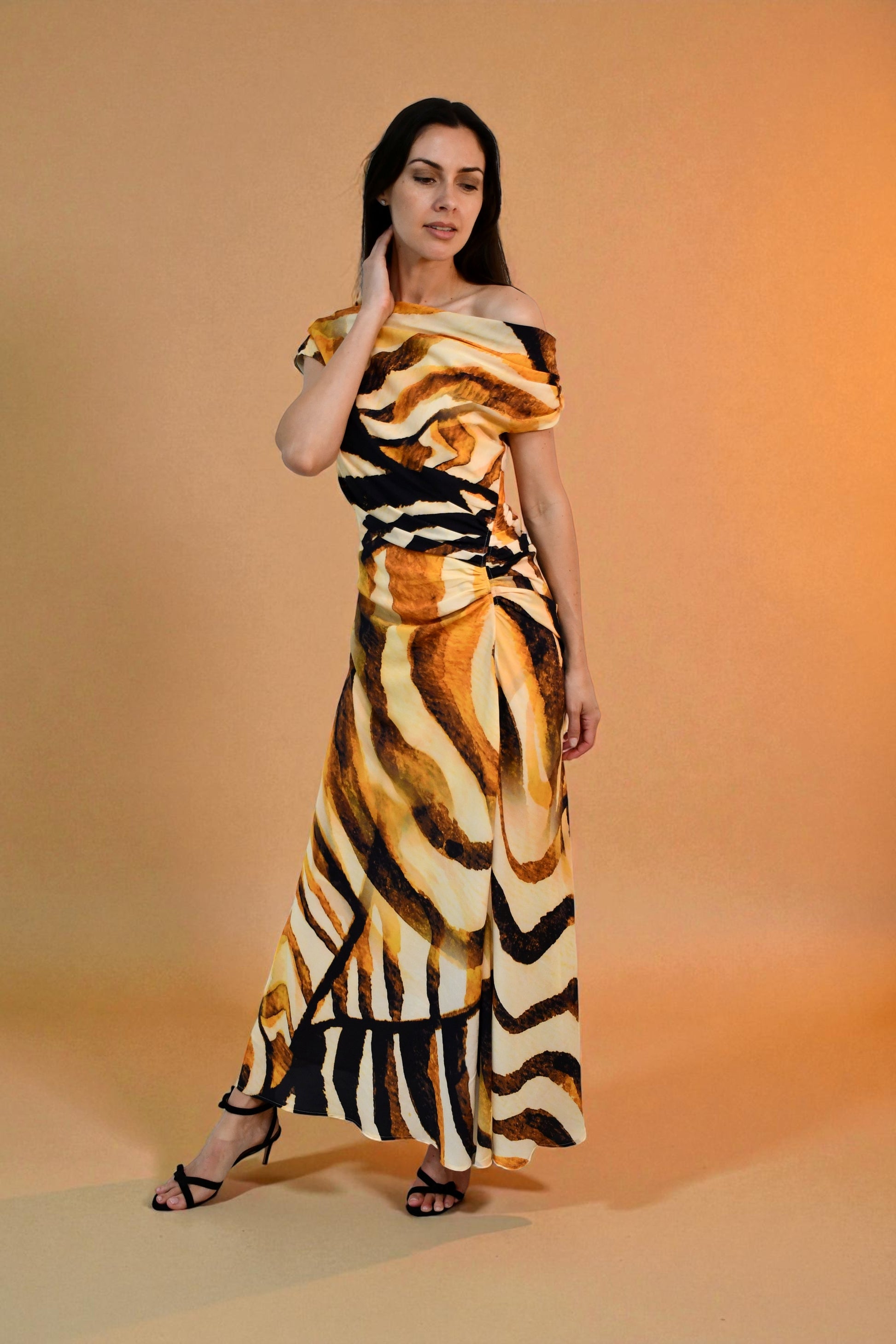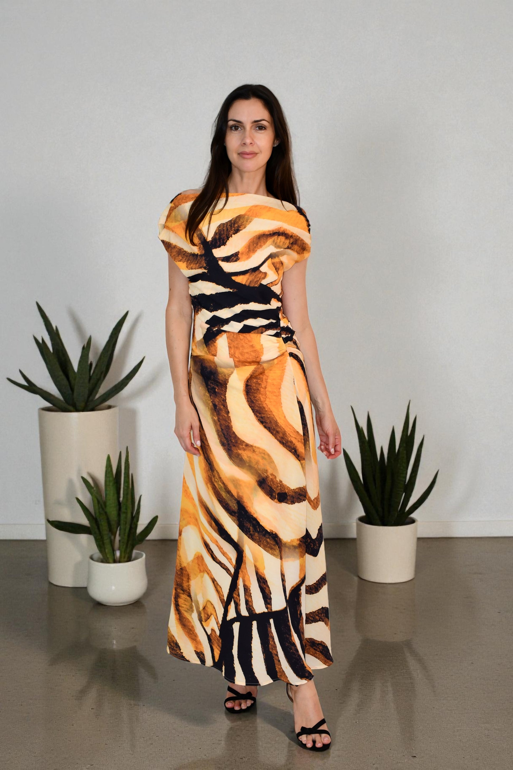 This striking maxi dress features an eye-catching abstract print in warm earthy tones, creating a modern, painterly take on animal-inspired patterns. Designed with soft draping through the bodice and gentle ruching at the waist, it enhances the natural silhouette while offering comfortable, flattering wear.