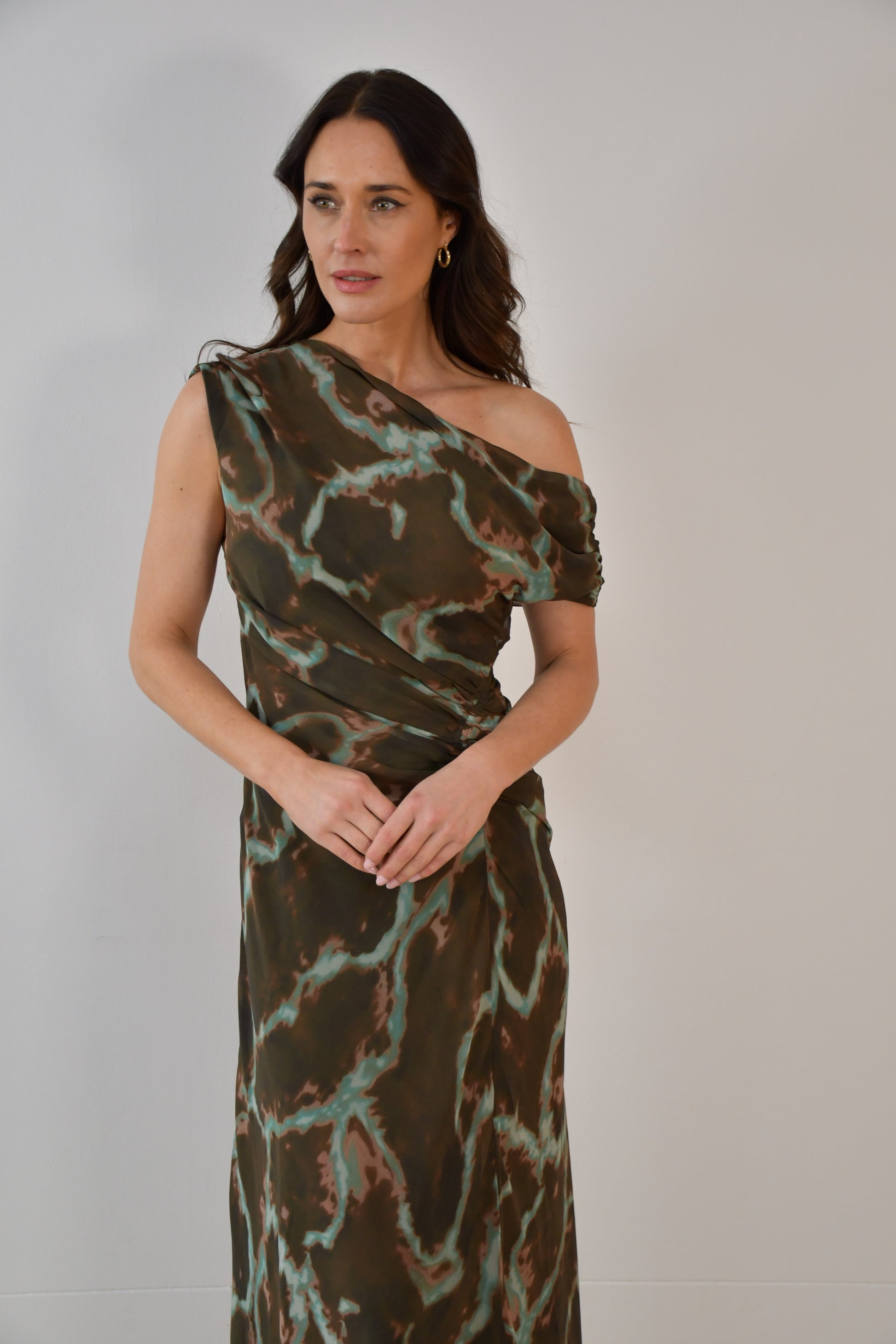 Turn heads with this sophisticated one-shoulder maxi dress, featuring a draped neckline and a fluid silhouette. The earthy abstract print blends deep olive tones with soft aqua and copper accents, creating a rich, artistic look. Designed with subtle ruching at the waist, it flatters the figure while offering graceful movement with its lightweight, semi-sheer overlay. Perfect for evening occasions, cocktail parties, or formal resort wear.