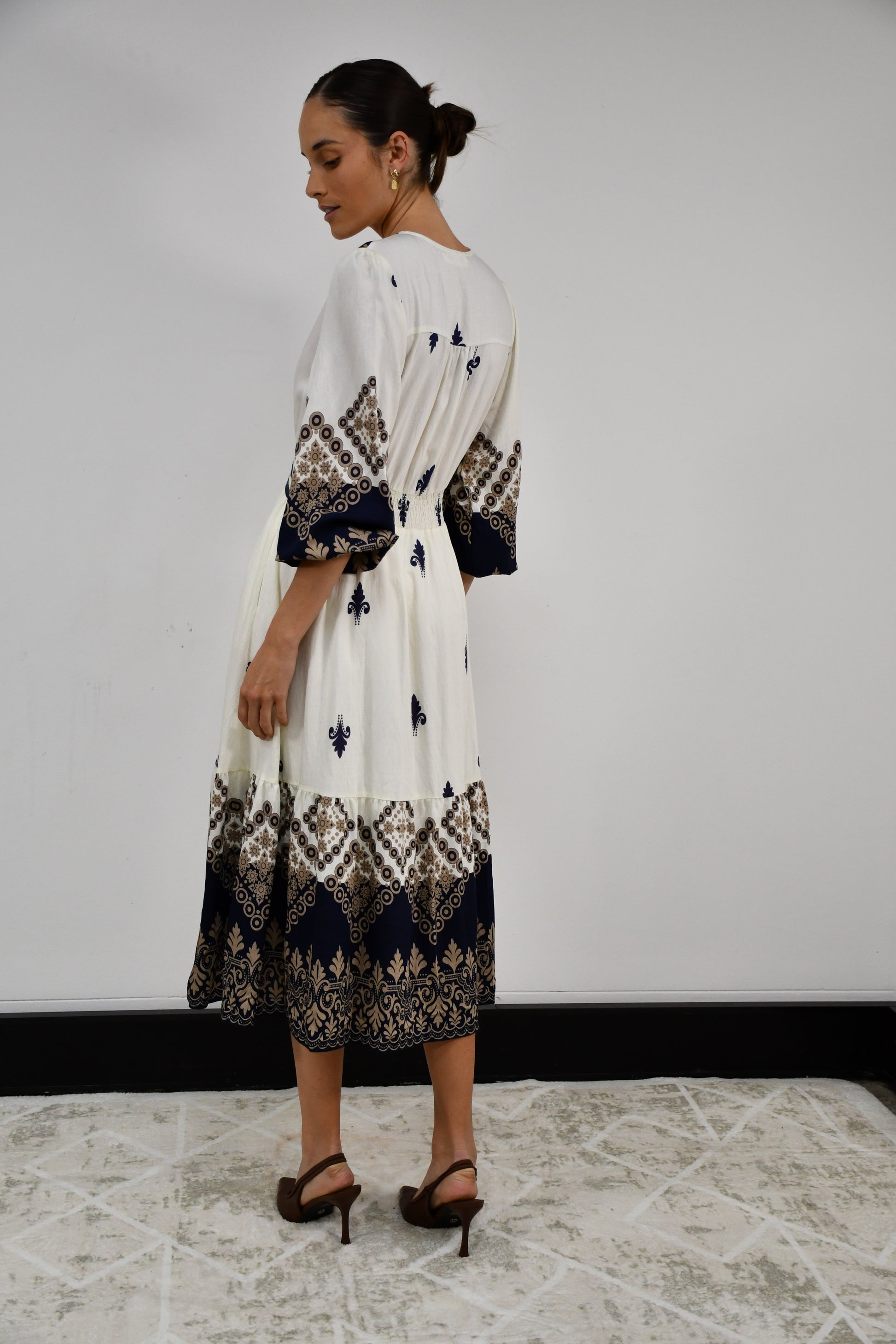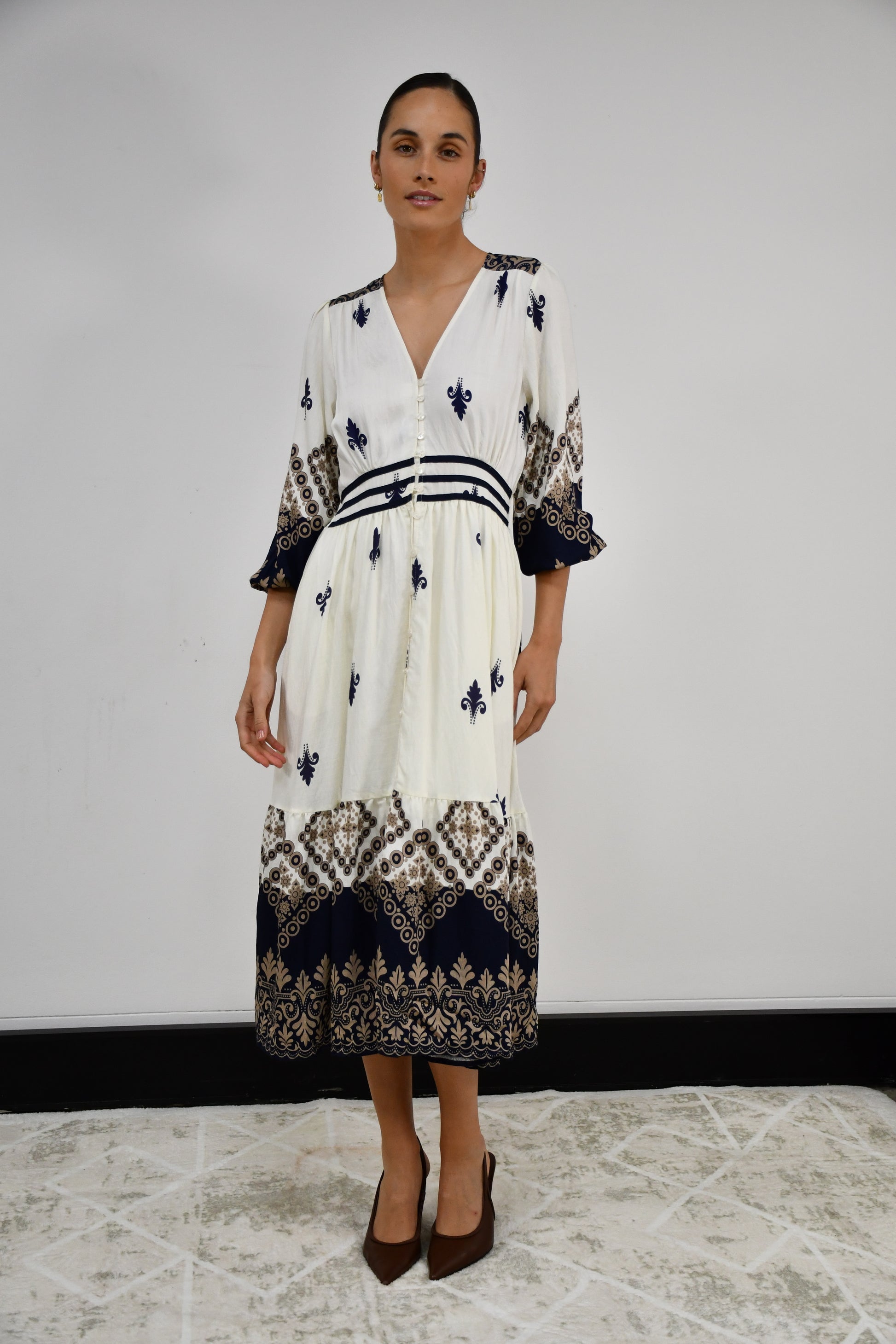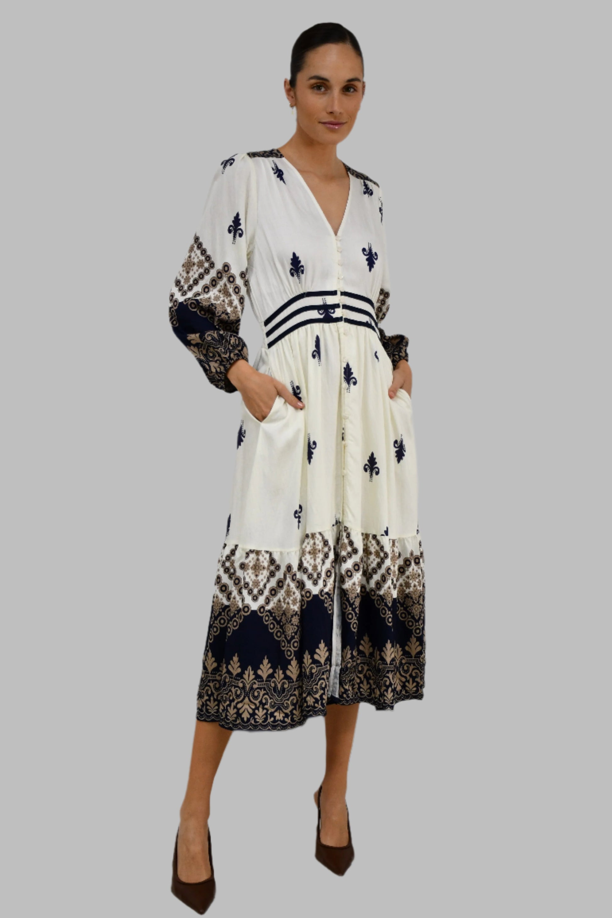 Elevate your wardrobe with this elegant bohemian-inspired midi dress, crafted in a soft ivory base adorned with intricate navy and taupe prints. Featuring a V-neckline and functional front buttons, the dress is defined by its mixed print patterns—fleur-de-lis motifs on the bodice and skirt, complemented by ornate geometric and baroque-inspired borders. The long sleeves with shirred cuffs, empire waistline with navy trim detailing, and full gathered skirt add a flattering, feminine silhouette. Side pockets offer both style and practicality, making this a perfect piece for casual chic days or dressy occasion