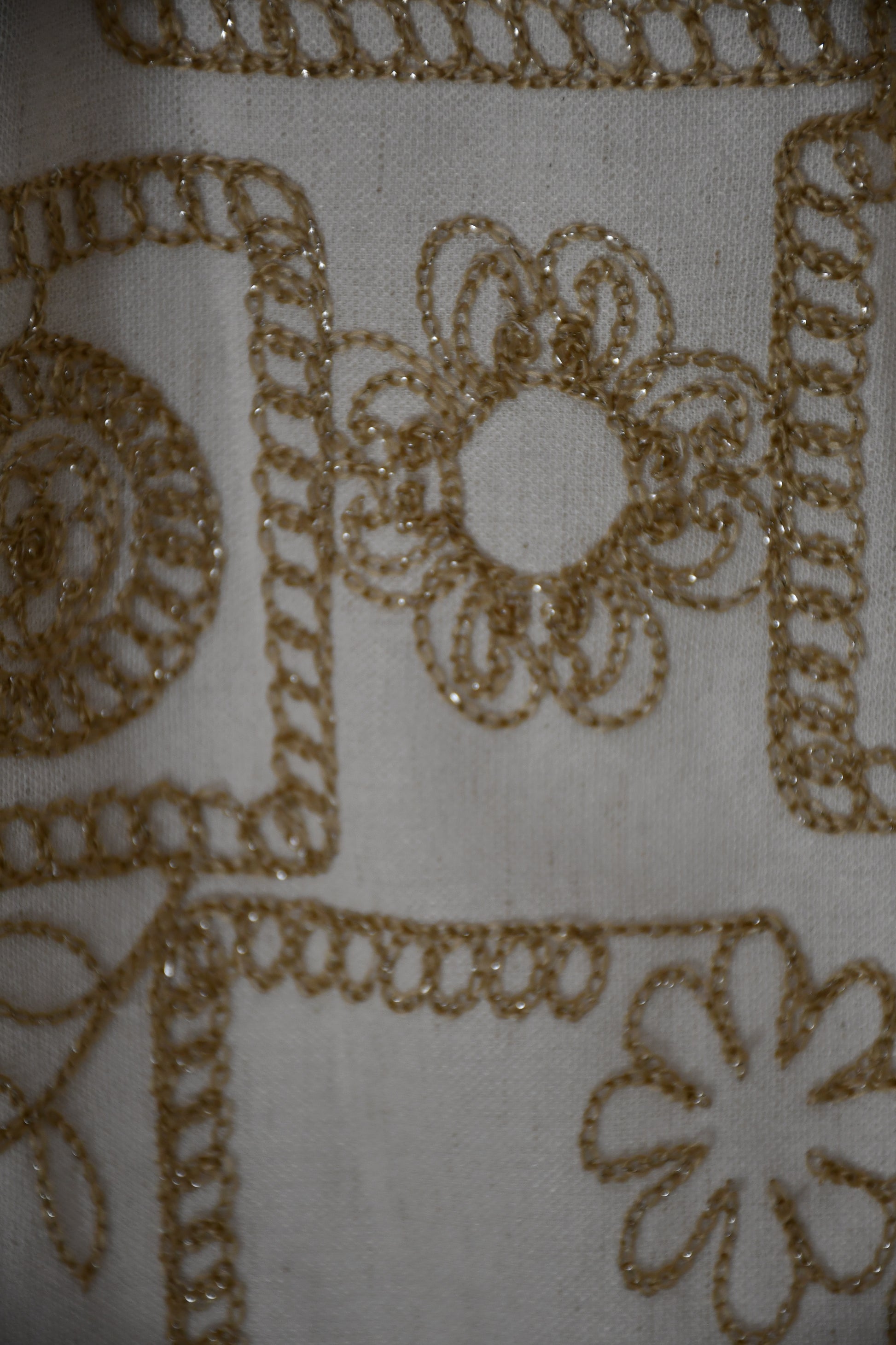 This lined elegant maxi skirt features an ivory base adorned with intricate gold geometric and floral motifs, creating a refined and timeless look. Designed with a high waist and soft pleating, it offers graceful movement and a flattering silhouette. The ankle-length cut makes it versatile for both daytime sophistication and evening chic. Pair it with a fitted top for a polished outfit or a casual blouse for an effortlessly stylish ensemble.