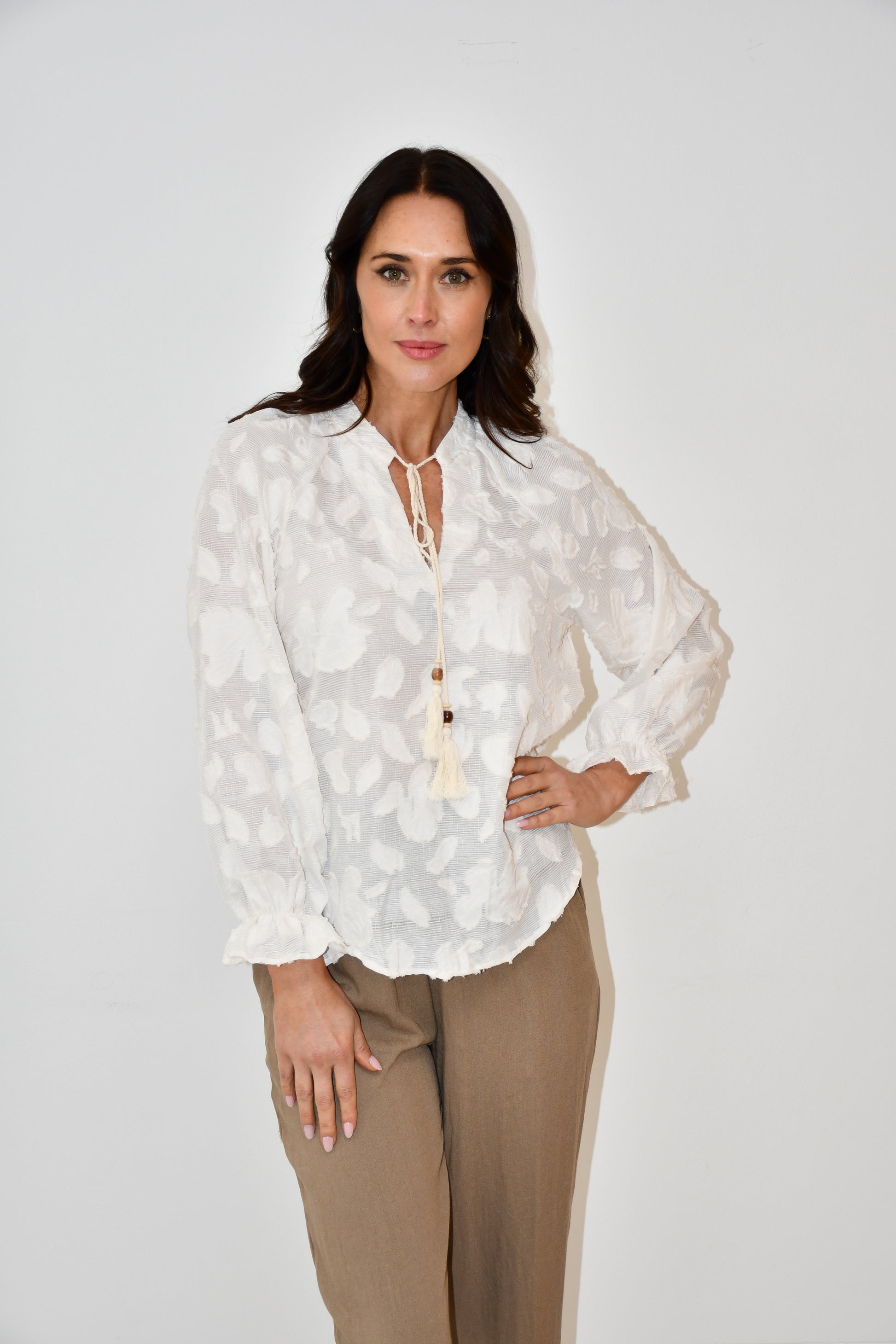 A breezy and feminine blouse featuring a sheer textured floral design on lightweight fabric. The relaxed silhouette is detailed with a tie neckline finished with tassels and wooden bead accents, adding a boho-inspired touch. Long sleeves with elastic cuffs create subtle volume, while the scalloped hemline gives a soft finish. Perfect for layering over camisoles or styling with jeans and skirts for an effortlessly chic look.