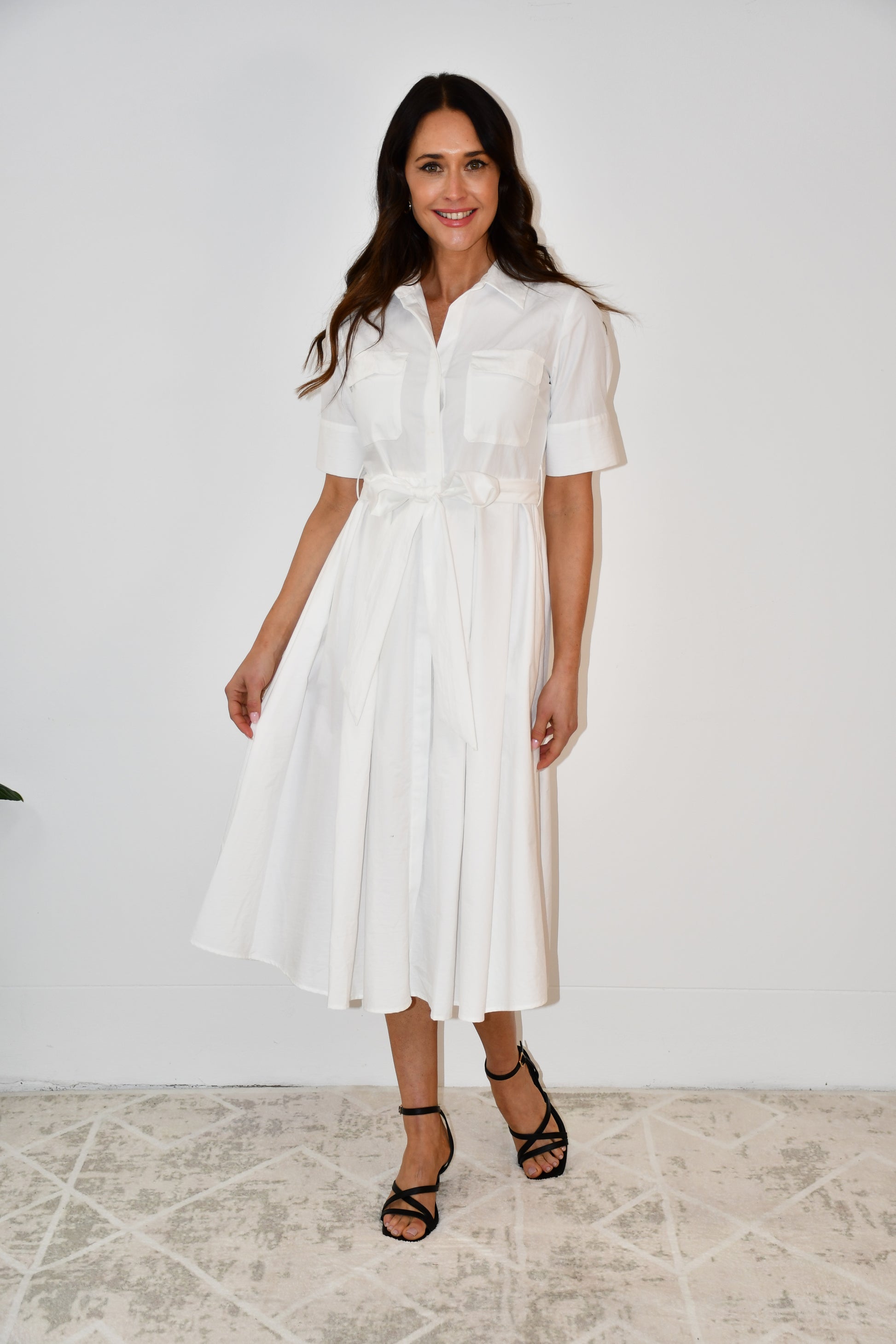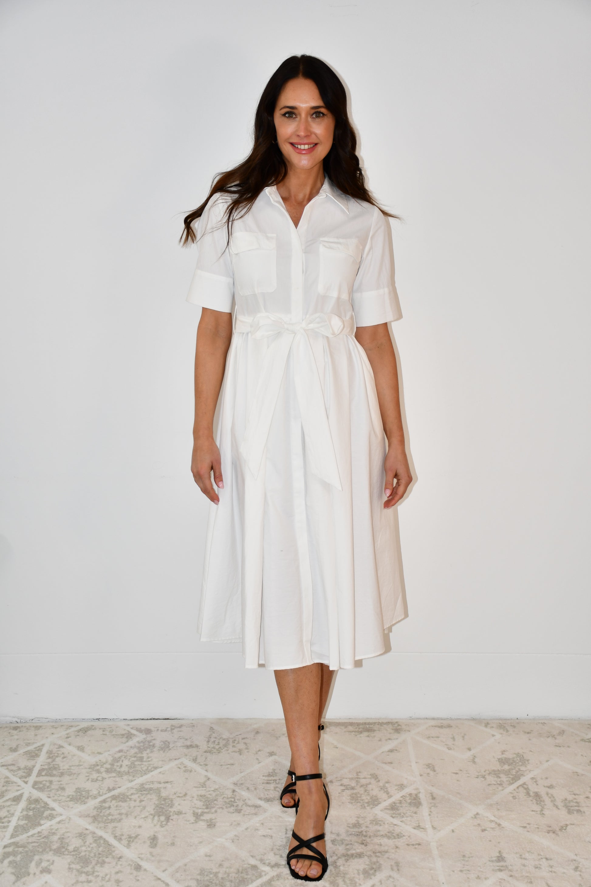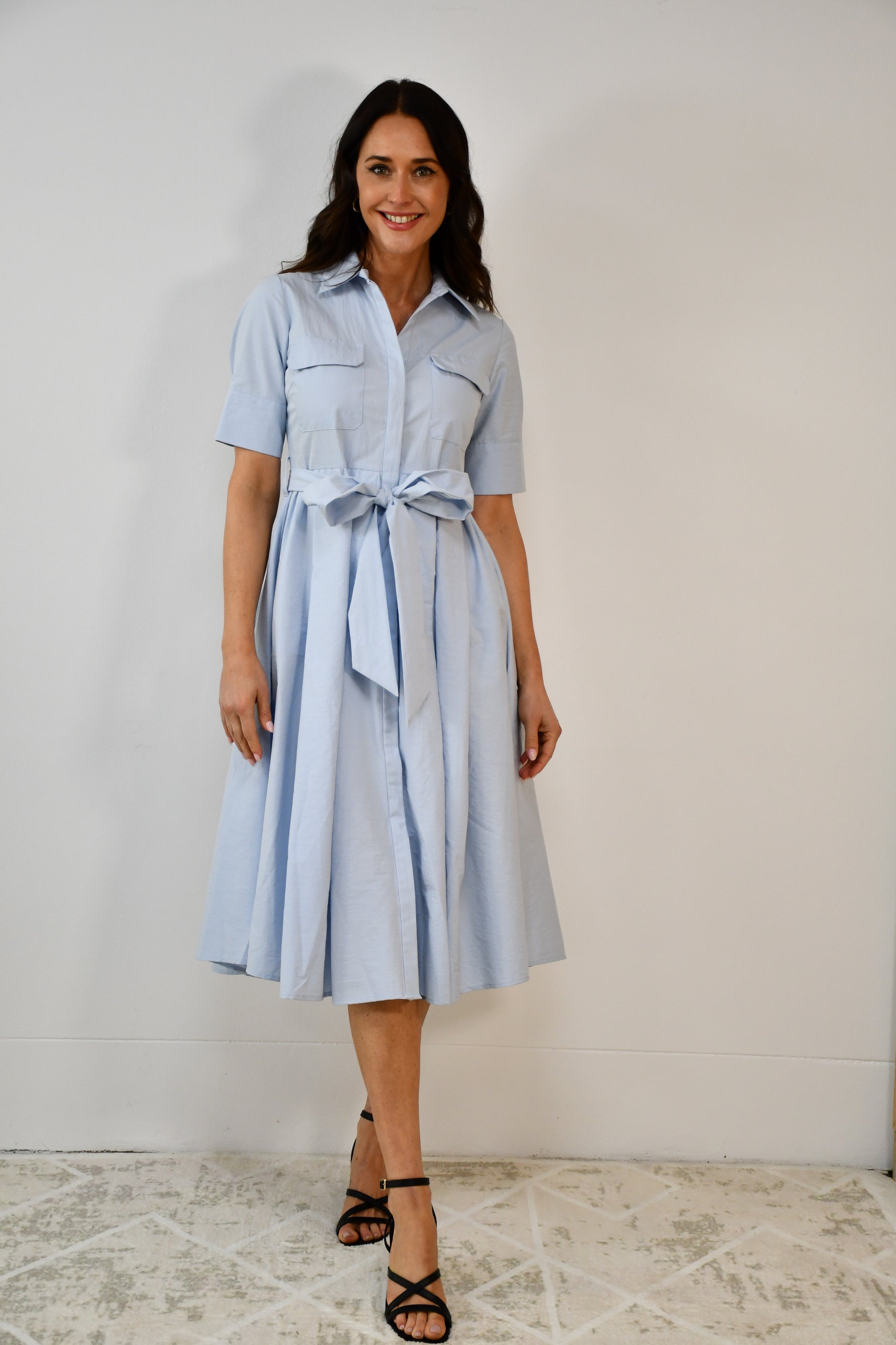 A classic shirt dress reimagined with modern elegance, featuring a collared neckline, button-down front, and short sleeves. Designed with two flap chest pockets for a utility-inspired touch, while the self-tie belt cinches the waist for a flattering silhouette. Crafted in a light blue fabric, this midi dress flows effortlessly for both casual and semi-formal occasions. Pair with sandals for daytime ease or heels for a polished look.