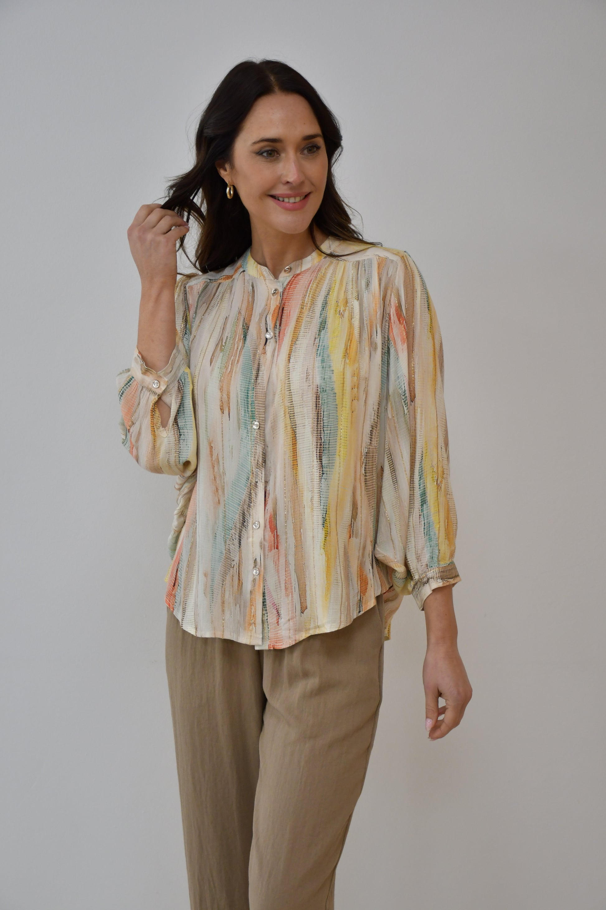 A lightweight blouse featuring painterly vertical stripes in earthy tones of beige, coral, mustard, and teal. Designed with a round neckline, button-down front, and long sleeves with the option to roll up for a relaxed look. The airy fabric and loose silhouette make it an easy piece for everyday wear, perfect for pairing with jeans, tailored pants, or skirts for a chic yet effortless outfit.